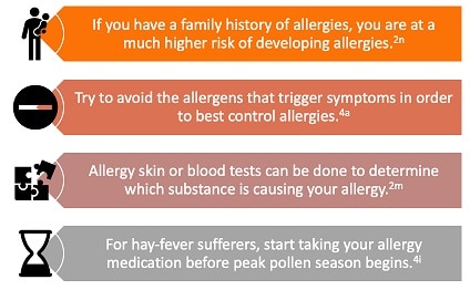 Back to topThe first rule of managing allergy is avoidance. This may not be possible in many instances! Your doctor or pharmacist may recommend an allergy medication to manage your symptoms effectively.4 These medications may include antihistamines tablets or syrup, nasal corticosteroid sprays, saline sprays or decongestants.4,5