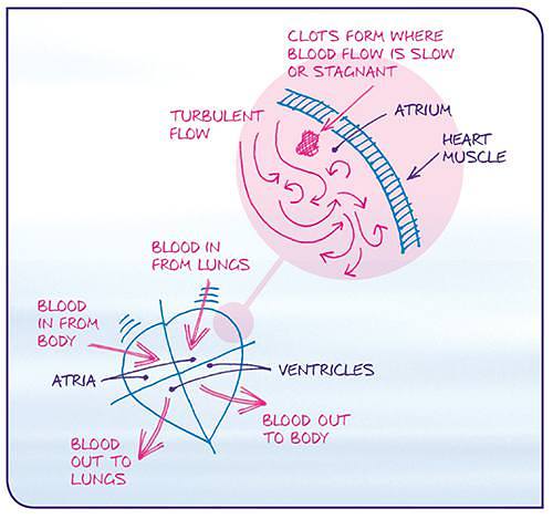 Not surprisingly the heart works less effectively as a pump in atrial fibrillation, resulting in symptoms like a rapid heart rate, difficulty breathing, tiredness and light-headedness. Now there are also areas within the heart where blood flow is slow or stagnant. Where this happens blood clots can form and it is these that account for the increased risk of stroke associated with atrial fibrillation.