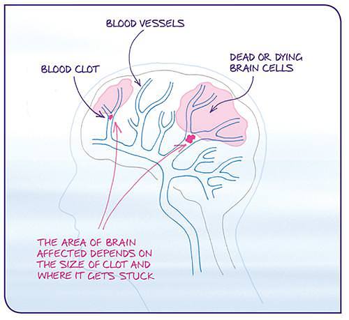 This is what happens in a stroke – or more specifically in an ischaemic stroke (meaning one caused by an interruption in the blood supply). Because clots forming in the heart may be quite big they can block the larger blood vessels that supply large areas of the brain. Consequently, strokes arising from an irregular heartbeat or atrial fibrilation can be very serious, which is why it is so important to prevent clots forming in the heart.