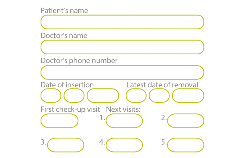 To make it easier to remind yourself when your Mirena® should be removed or replaced please make a note of the following information and place the provided card somewhere safe. You can also record the information on this page in the area under the card: